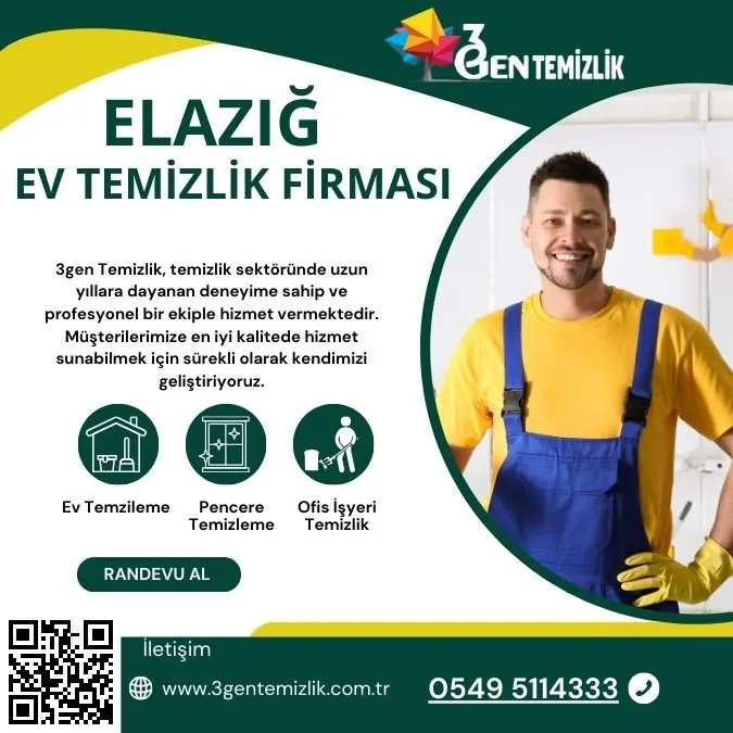 Güvenilir ve profesyonel bir temizlik hizmeti arıyorsanız, 3GEN Hizmet Grubu olarak yanınızdayız. Size sadece kaliteli hizmet sunmakla kalmıyor, aynı zamanda uygun fiyatlarla da bu hizmetleri sağlamaktayız. Elazığ’daki temizlik ihtiyaçlarınız için hemen bizimle iletişime geçin ve detaylı bilgi alın. Unutmayın, temiz bir ortam hem ruh halinizi hem de verimliliğinizi olumlu yönde etkiler.