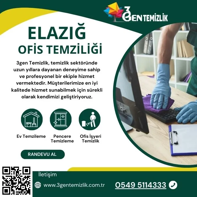 Güvenilir ve profesyonel bir temizlik hizmeti arıyorsanız, 3GEN Hizmet Grubu olarak yanınızdayız. Size sadece kaliteli hizmet sunmakla kalmıyor, aynı zamanda uygun fiyatlarla da bu hizmetleri sağlamaktayız. Elazığ’daki temizlik ihtiyaçlarınız için hemen bizimle iletişime geçin ve detaylı bilgi alın. Unutmayın, temiz bir ortam hem ruh halinizi hem de verimliliğinizi olumlu yönde etkiler.